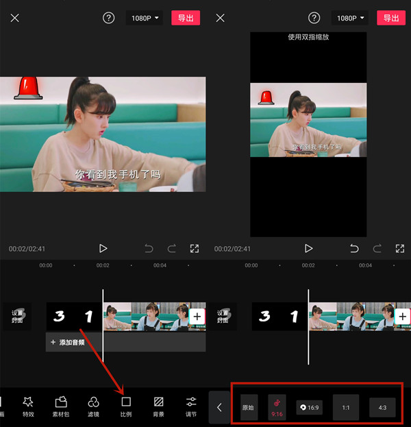 还可在剪辑页面点击比例,选择画面比例大小。