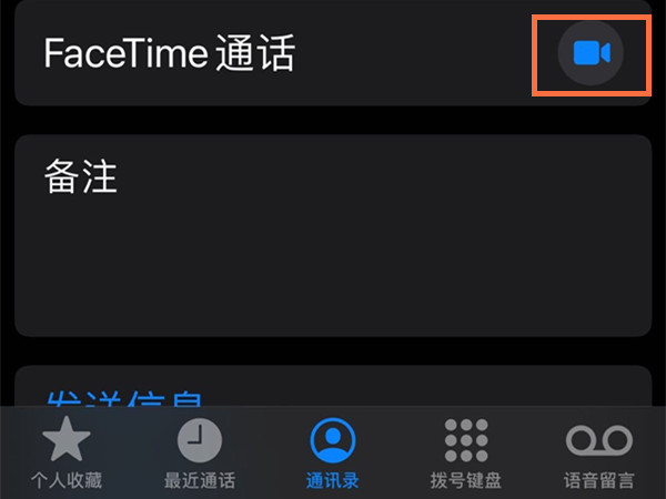 2、在联系人页面点击facetime通话右侧的视频图标即可。