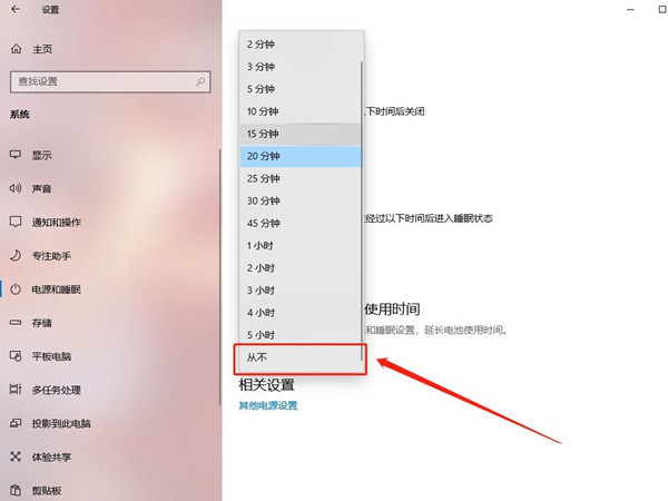 3、点击电源和睡眠,在屏幕时间中选择【从不】即可关掉自动锁屏。