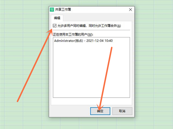 2、勾选允许多用户同时编辑,再点击确定,保存表格。