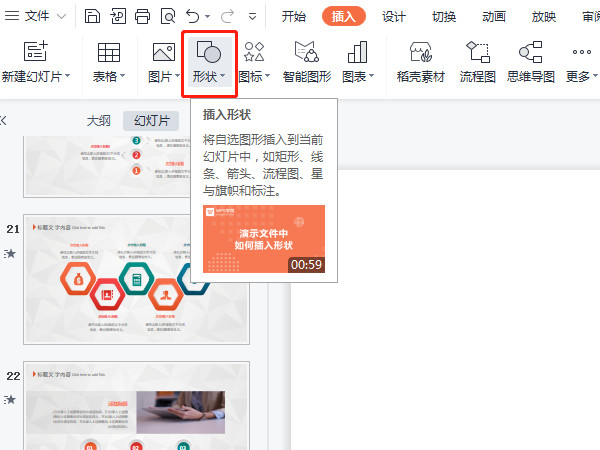 1、打开ppt文稿,在“插入”中点击【形状】。