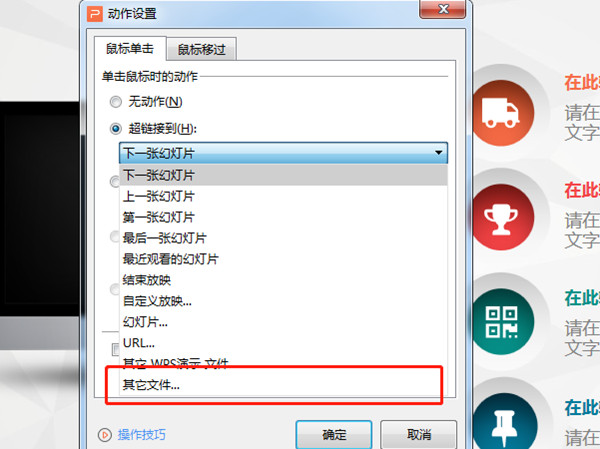 2、勾选【超链接到】,点击【其他文件】,选择要播放的视频影片即可。