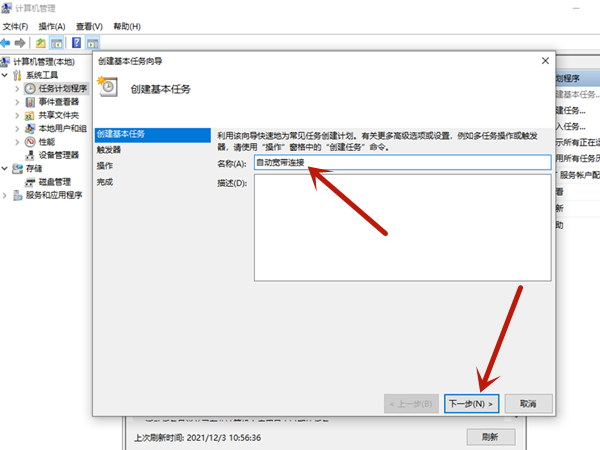 3、编辑名称后,点击下一步,点击计算机启动时,点击下一步。