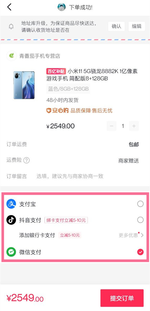 抖音退款显示退款成功后,钱将原路返回付款账户,抖音可支持支付宝、微信和绑定银行卡支付。选择支付方式教程如下: