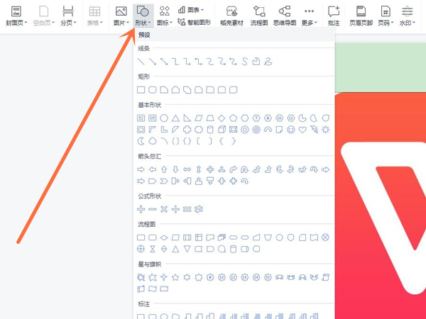 2、在插入菜单下,找到形状选项,可以选择自己想要绘制的形状样式。