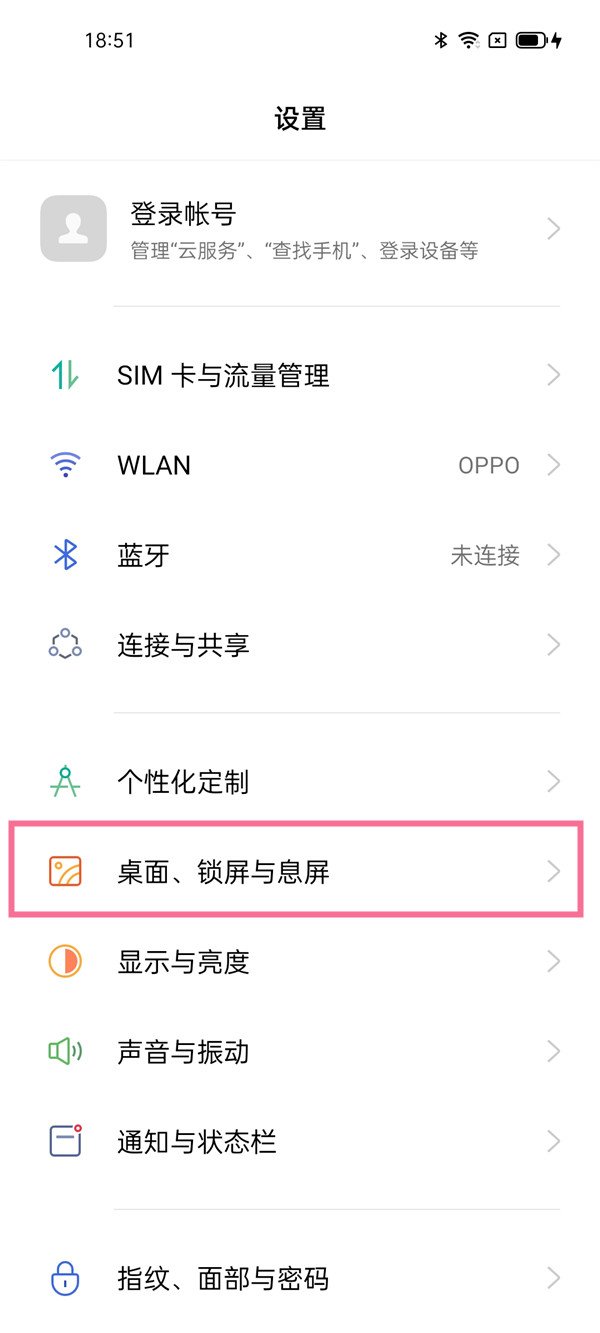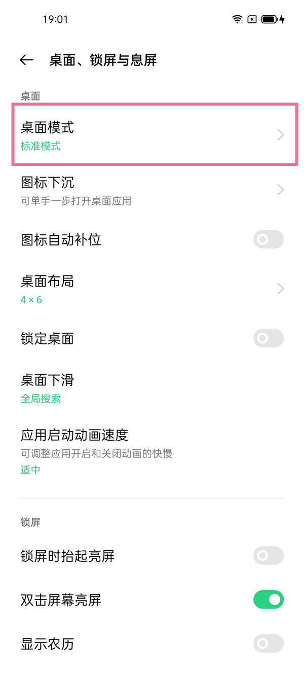 1、在手机设置中点击顶部的【桌面、锁屏与息屏】。