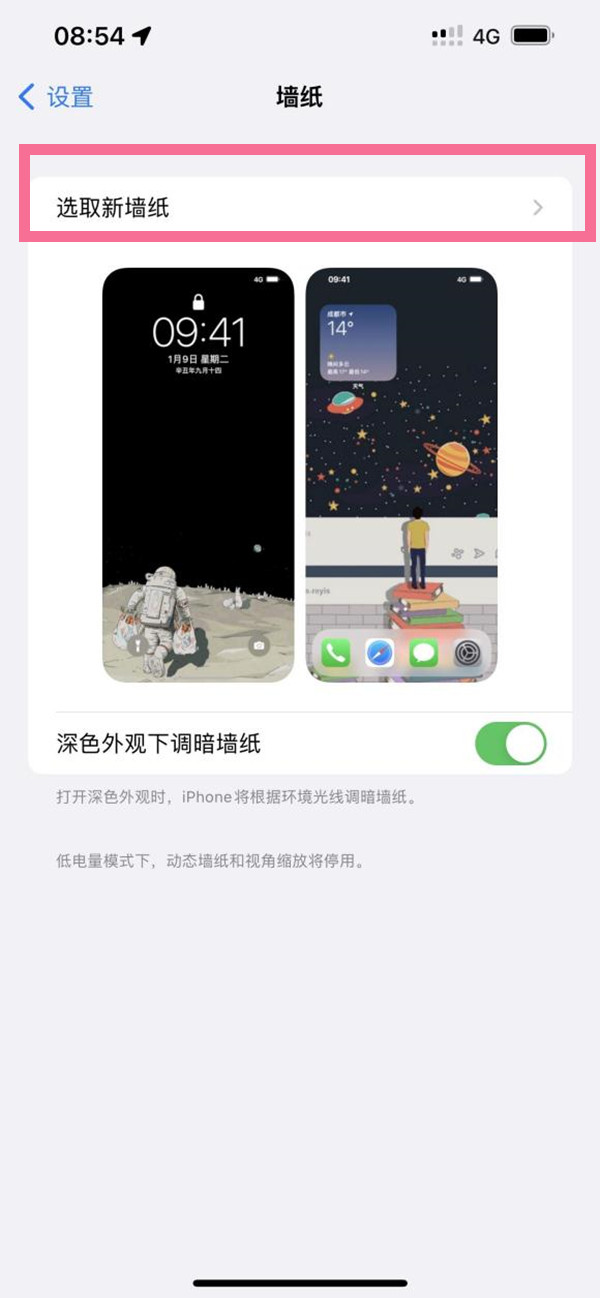 2、点击【选取新墙纸】,从相册中选择你好图片设为墙纸即可。