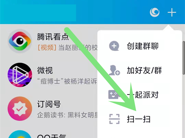 2、再打开手机QQ,点击右上角扫一扫,对着平板页面的二维码登录即可。