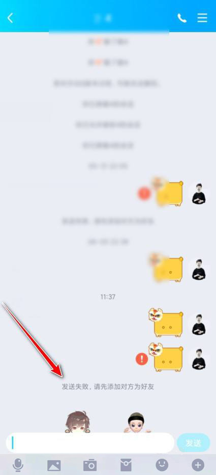 2、给对方发送聊天消息,若提示发送失败需添加对方为好友则表示对方删了你。
