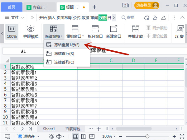 2、点击冻结窗格下拉三角箭头头后,点击冻结至第1行后按流程打印即可。