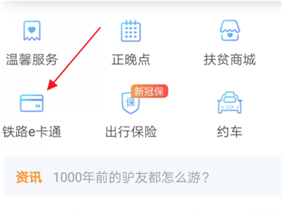 1、打开【铁路12306】APP,在主页点击【铁路e卡通】选项。