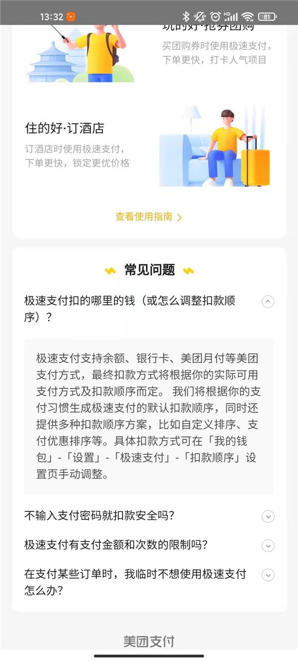 美团极速支付用的是哪里的钱?美团极速支付支持余额、银行卡、美团月付等美团支付方式,最终扣款方式将根据你的实际可用支付方式及扣款顺序而定。