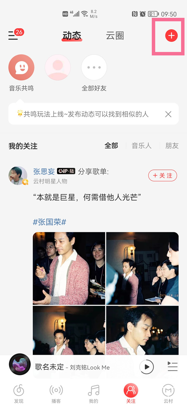 1、打开手机网易云音乐,在“关注”界面点击右上角的【+】。