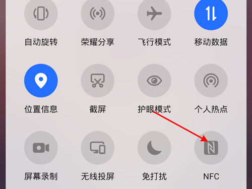 1、从手机屏幕顶端向下拉,点击nfc图标打开手机nfc。