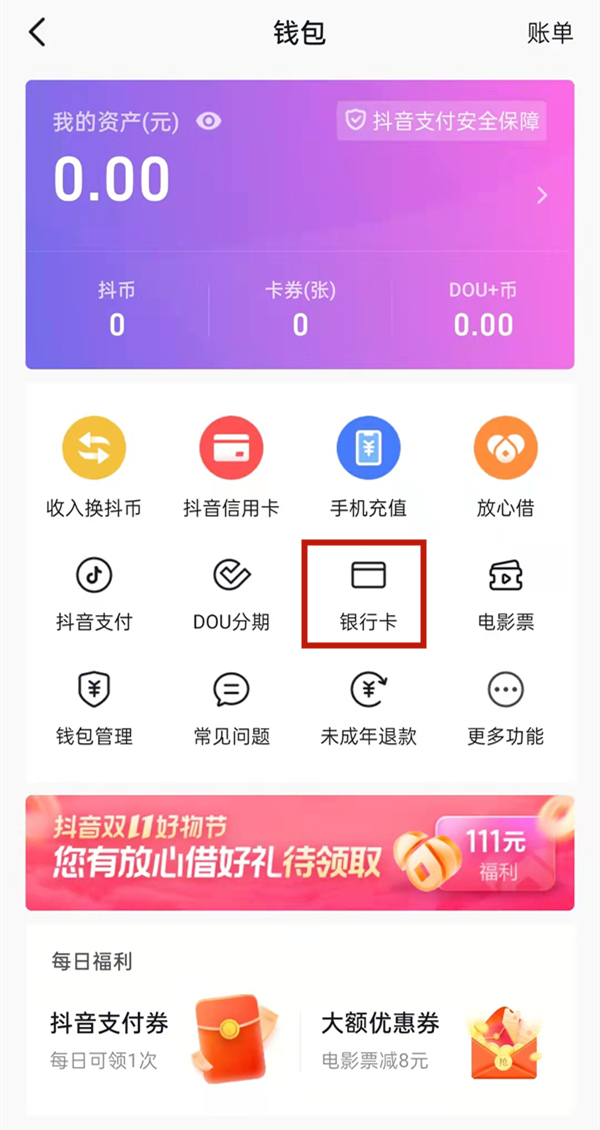 抖音可以绑定银行卡,只需要进入钱包页面后,找到银行卡并输入卡号绑定即可,具体操作步骤如下:
