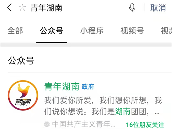 3、微信搜索青年湖南公众号后进入即可。