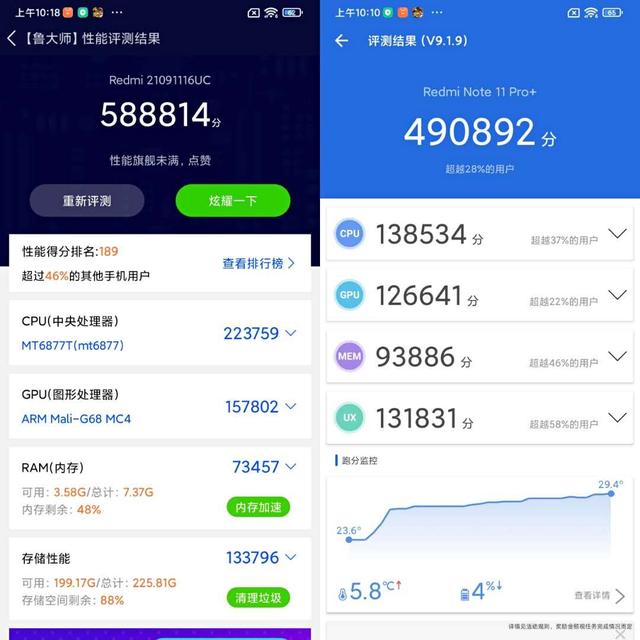 在存储规格上,红米Note 11 Pro+采用了LPDDR4x + UFS 2.2的组合。从实际跑分来看,该机的安兔兔成绩接近50万分,鲁大师性能评测成绩超过了58万分,这一表现在中端机中算是主流水平,日常使用已经足够。