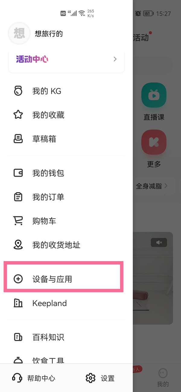 1、打开keep app,点击左上角头像,点击【设备与应用】。