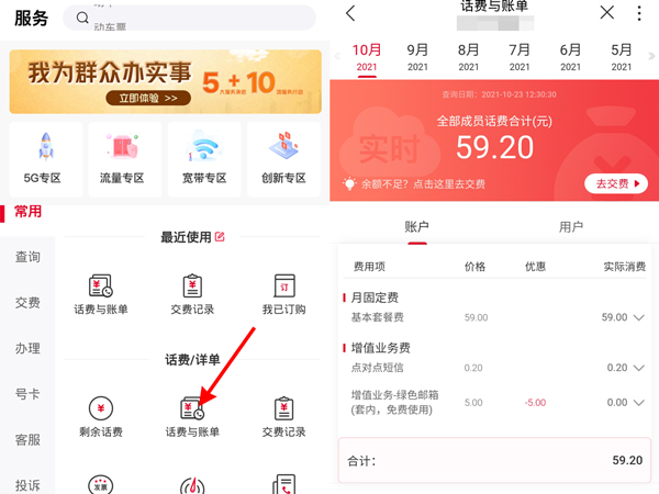 2、点击【话费与账单】,即可查询每月账单。