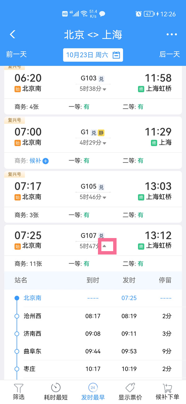 2、点击车次下方时间旁边的倒三角图标即可查看途径车站信息。