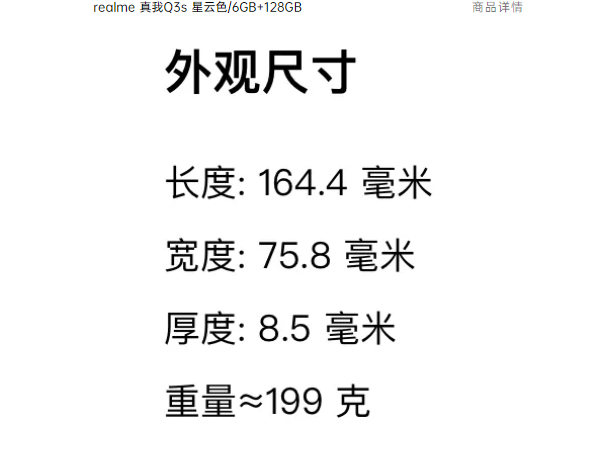 真我q3s机身尺寸?真我q3s机身尺寸是164.4*75.8*8.5mm,重199克,屏幕比例20.1:9,分辨率2412*1080,401PPI,屏占比超过90%。