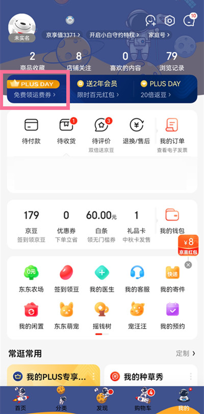 1、打开手机京东,在“我的”界面点击PLUS会员。