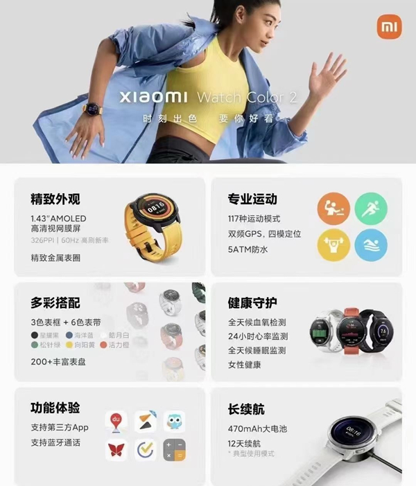 小米手表color2健康功能上,全天候血氧检测、24小时心率监测、全天候睡眠监测、女性健康等。续航方面,配470mAh电池,典型模式下12天续航,长续航模式24天,30小时GPS运动续航。在运动上,支持117种运动模式,19种专业运动模式,支持双频GPS、四模定位、5ATM防水(游泳可佩戴)。