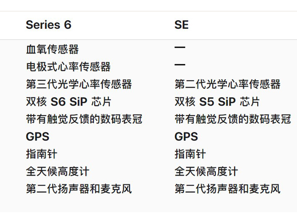 其余方面均相同,iwatch se拥有和 Series 6 一样宽大的显示屏,配备摔倒检测功能、指南针以及全天候高度计,44 毫米或 40 毫米表壳,50米防水,心率过高或过低时的预警通知,SOS 紧急联络,GPS + 蜂窝网络。Apple Watch Series 6 的水晶玻璃表背中拥有四组由绿色、红色和红外 LED 组成的光簇,以及四个光电二极管,可用于测量你的血氧水平;它还配备光学心率传感器,用来测量你的心率和心律;它的数码表冠能在转动时为你提供触觉反馈;S6 SiP 芯片配备 64 位双核处理器,其速度比 Apple Watch Series 5 中的 S5 芯片最高可提升 20% 之多;全天候高度计可实时测量你当前位置的海拔高度。