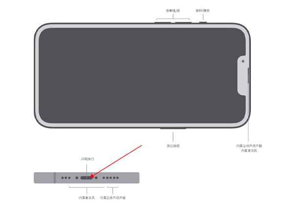 1、在机身底部找到充电口,再在包装盒中拿出USB-C转闪电连接线的充电线。