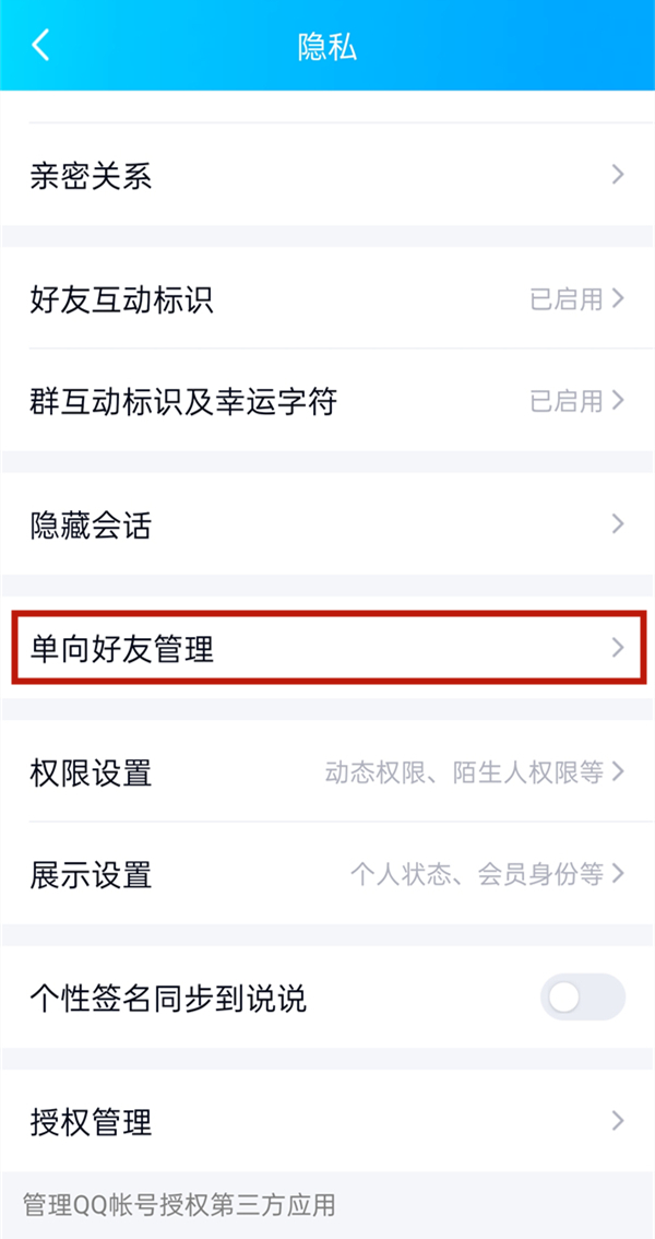 qq单向好友无法直接查看是谁删了谁,只能在手机设置的隐私设置里通过单向好友管理来判断谁删了谁,有名单的话就是自己删了别人,没有的话就是别人删除了自己。具体操作步骤如下: