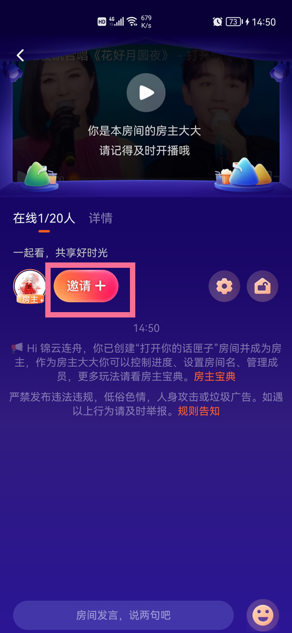 3、将二维码分享给好友后,房主点击开播的按键即可一起观看。