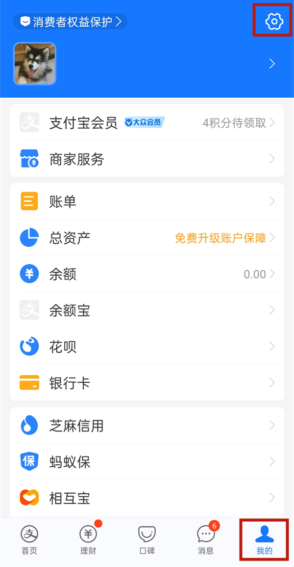 1、打开支付宝,点击右下角我的,点击设置图标。