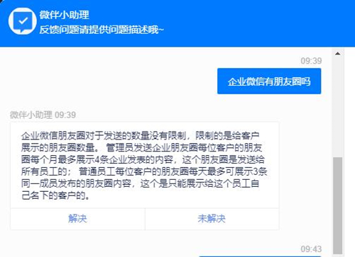 管理员发送企业朋友圈每位客户的朋友圈每个月最多展示4条企业发表的内容,这个朋友圈是发送给所有员工的; 普通员工每位客户的朋友圈每天最多可展示3条同一成员发布的朋友圈内容,这个是只能展示给这个员工自己名下的客户的。