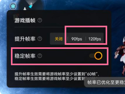 2、点击游戏插帧,在游戏插帧页选择自己需要的帧率即可,还可以开启稳定帧率。