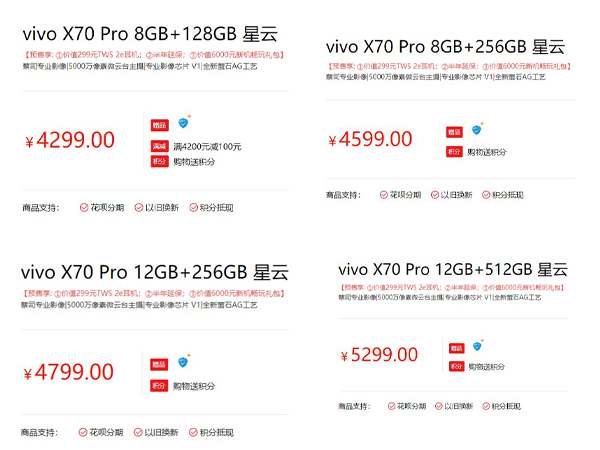 vivox70pro多少钱?vivox70pro价格8+128GB版本官方定价为4299元,8+256GB为4599元,12+256GB为4799元,12+512GB版为5299元。