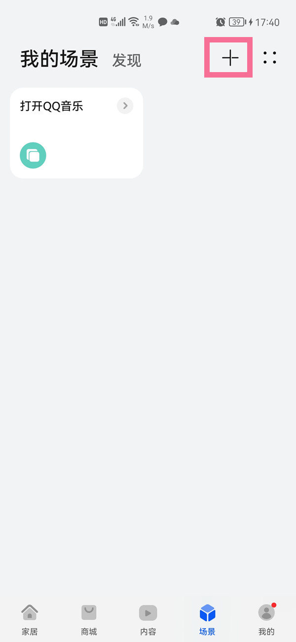 1、打开华为智慧生活APP,在“场景”页面点击右上角的【+】创建快捷指令。