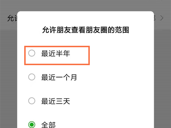 4、在允许朋友查看朋友圈的范围选项中选择最近半年即可。