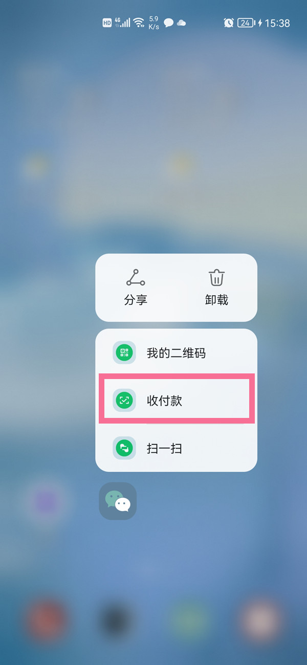 1、在手机桌面上长按微信图标,找到收付款快捷菜单。