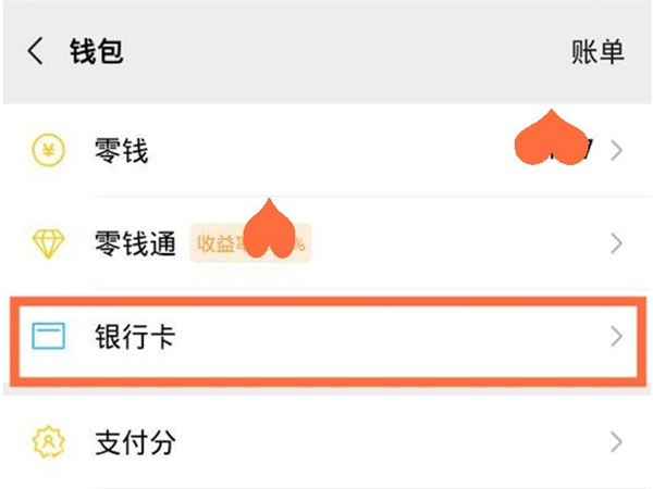 2、点击【钱包】选项,点击【银行卡】。