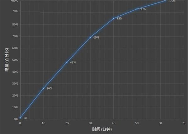 在实际充电测试中,从1%了开始充电的,充满总共耗时62分钟左右,能在一小时内充满100%的电量。