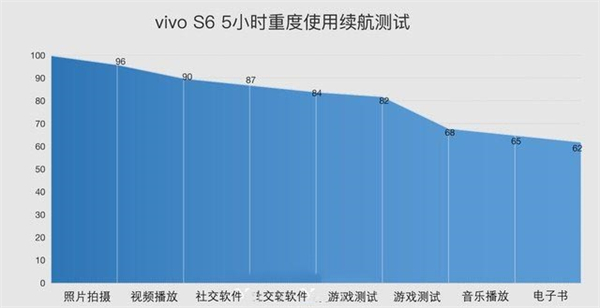 我们在vivos6电池满电情况下,使用一半的屏幕亮度和音量,清空后台程序,进行拍照、视频播放、刷微博等操作,并记录每个节点的剩余电量。其中,视频和游戏时间为1小时,其他项目为半小时,测试时长共5小时。