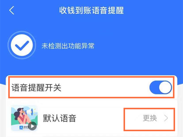 3、将语音提醒开关右侧的按钮开启即可,还可以更换语音提醒的声音。