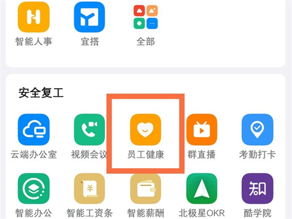 1、在手机钉钉“工作台”界面点击【员工健康】。