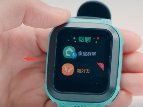 1、唤醒屏幕后向左边滑动屏幕,找到微聊功能,点击【家庭群聊】。