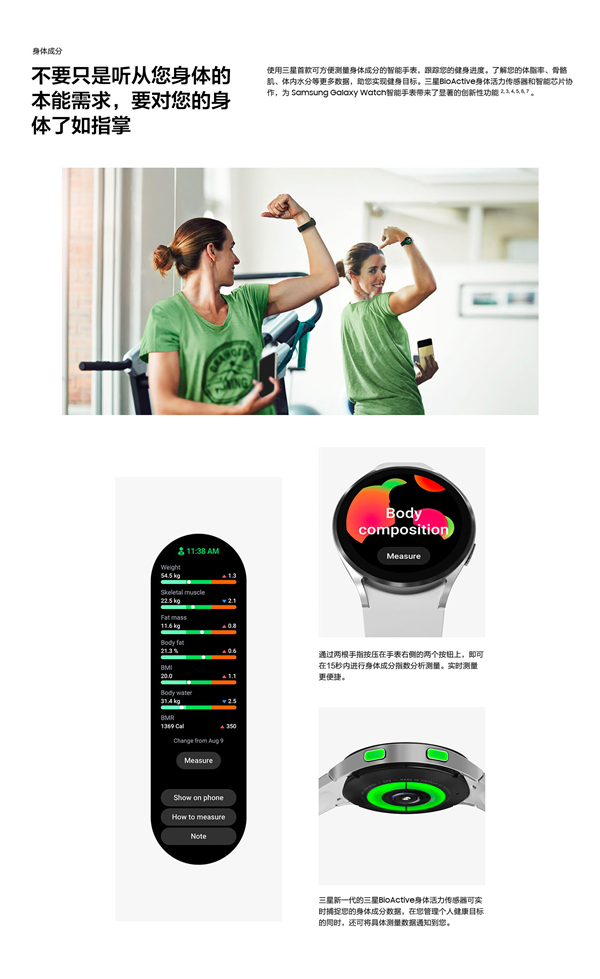通过两根手指按压在手表右侧的两个按钮上,即可在15秒内进行身体成分分析测量,还会有测量数据进行通知。还可以检测身体活动并追踪日常活动状况,支持90多种锻炼,会产生更精确的锻炼状态报告。还可以检测身体活动并追踪日常活动状况,支持90多种锻炼,会产生更精确的锻炼状态报告。内置睡眠传感器,在休息的时候可以检测并全面分析睡眠阶段,。升级改进的测量选项可以让大家检查血氧水平和打鼾模式,以获得更好的睡眠质量和持续时间。