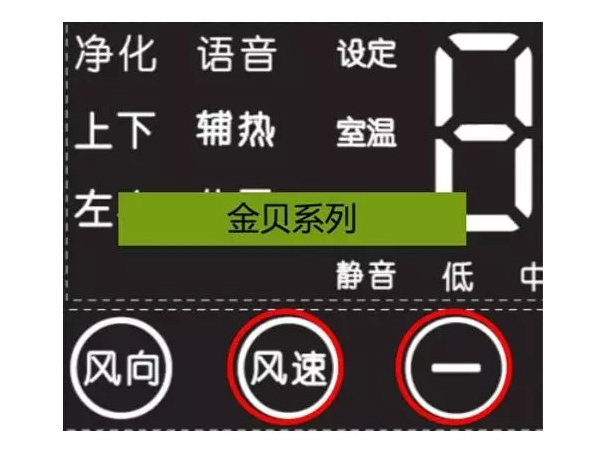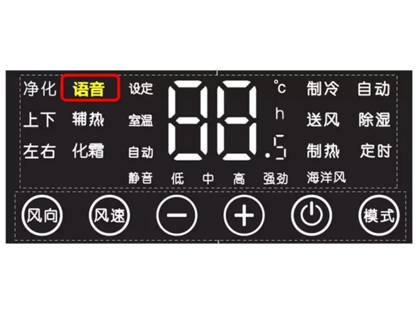 2、在待机状态语音功能关闭情况下,同时按下“风速”和“-”键3秒,可以开启语音功能,显示器上“语音”变为常亮。