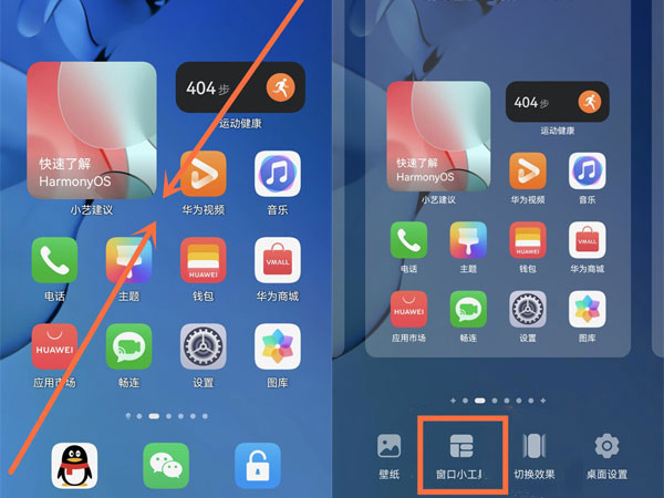 1、在手机桌面两指捏合进入主屏幕编辑状态,点击【窗口小工具】。