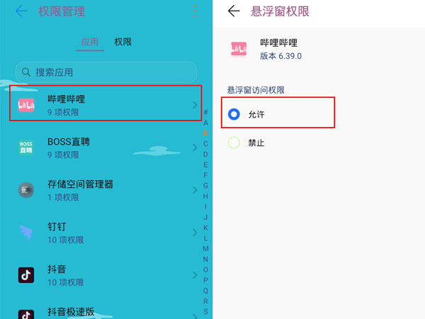 2、点击哔哩哔哩,点击悬浮窗勾选允许。