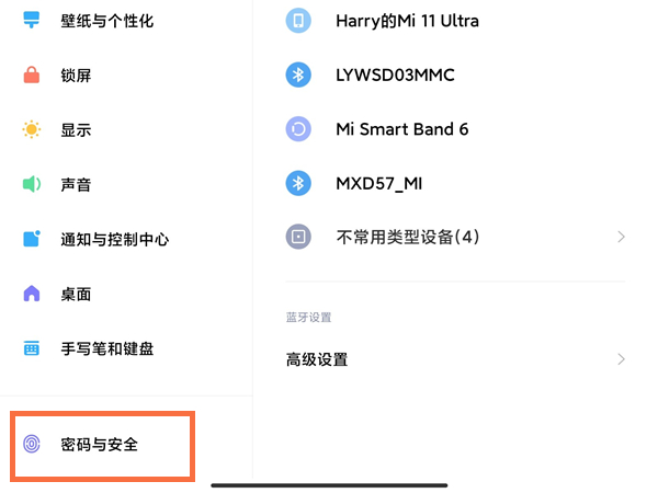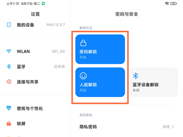 小米平板5支持密码解锁和人脸识别,设置解锁方式需两个步骤,在密码与安全中选择密码或者人脸解锁即可,具体操作步骤如下:
