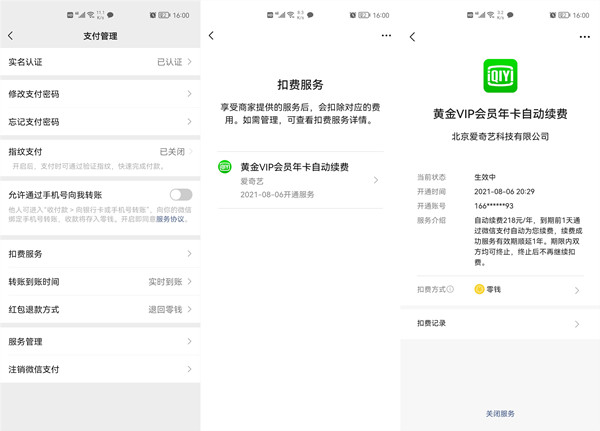 如果是通过微信开通的自动续费:点击设置-支付-右上角三点-扣费服务,点击爱奇艺续费项目,选择关闭服务即可。